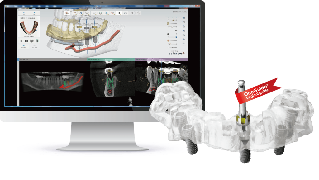 ガイデッドサージェリーインプラントは、サージカルガイドというものを用いてインプラントを埋め込む方法です。治療前にCTであごの骨の状態やインプラントを埋め込む位置をしっかり確認し、さらにインプラントシミュレーションソフトを使用してインプラントを埋め込む位置を決定します。