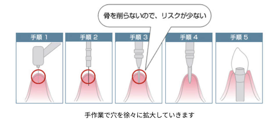 あごの骨に穴を開けるときにドリルを使用しない治療法です。手作業で少しずつ骨を広げていくため、必要最小限の深さに留めることができます。